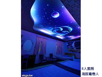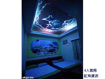 有別於一般的牆壁彩繪,「綠島藍海奇緣民宿」特別請到了專業團隊,運用了彩繪及最新藝術手法,讓白天看似一般的彩繪圖像,在關了燈後的黑暗中綻放出奇幻的光茫,一間間截然不同的空間面貌,像是「魟魚」「水母」「鯨魚」「熱帶魚攻擊星球」「海龜」等海底生物,以及「毒蠍子」「人魚先生」「月球」等栩栩如生的超真實景像,一幕幕結合彩繪與藝術的視覺演出,肯定讓您對「綠島藍海奇緣民宿」再添好評。