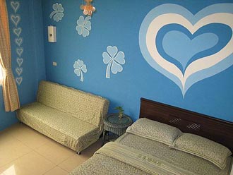 走進接待廳,可感覺到一股淡淡的南洋風,很自然也很慵懶,是一種結合海島、異國元素和悠閒感的混搭風格。「綠島藍色珊瑚島民宿」的每間客房皆有一主題房名,房內牆上大膽的彩繪創意,都呈現出與房名相互呼應的表情,每一個想法,皆來自於大自然所給的靈感,透過色彩表現,再加上簡單自然的寢俱搭配,用一種很簡單、隨性的手法,區隔出許多有如被施了魔法般的空間場景,不只講求舒適更重視視覺美感。不分裡外,您都是這麼的接近大自然。