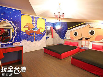 順著城堡般浪漫的庭園造景,在公主馬車和小矮人的熱情呼應下,步入富麗巍峨的別墅建築,鮮豔的造型壁圖、雅緻華麗的裝潢和唯美的歐風造型家具,帶您進入夢幻而甜美的童話氛圍。運用不同的豐富主題,融入富具創意的設計和思維,滿足每一位旅人的童年夢想~快來「台東民宿‧童話奇緣民宿」一同找回童真、童趣的未泯之心吧!